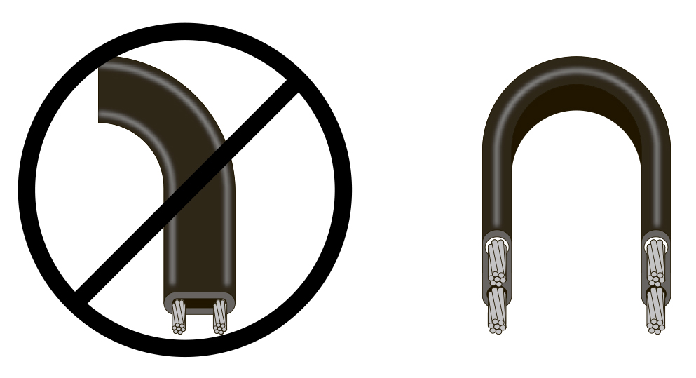 • Кабель должен изгибаться исключительно перпендикулярно плоскости его жил.