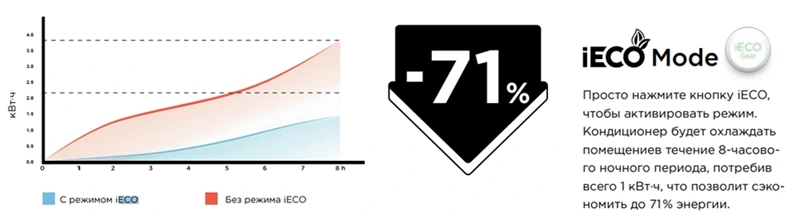 • Функция iECO — мгновенно обеспечит ваш дом комфортной температурой и поддержит ее, сокращая потребление энергии за счет новаторской технологии управления альфа-алгоритмов. Удобно использовать, как ночной режим.