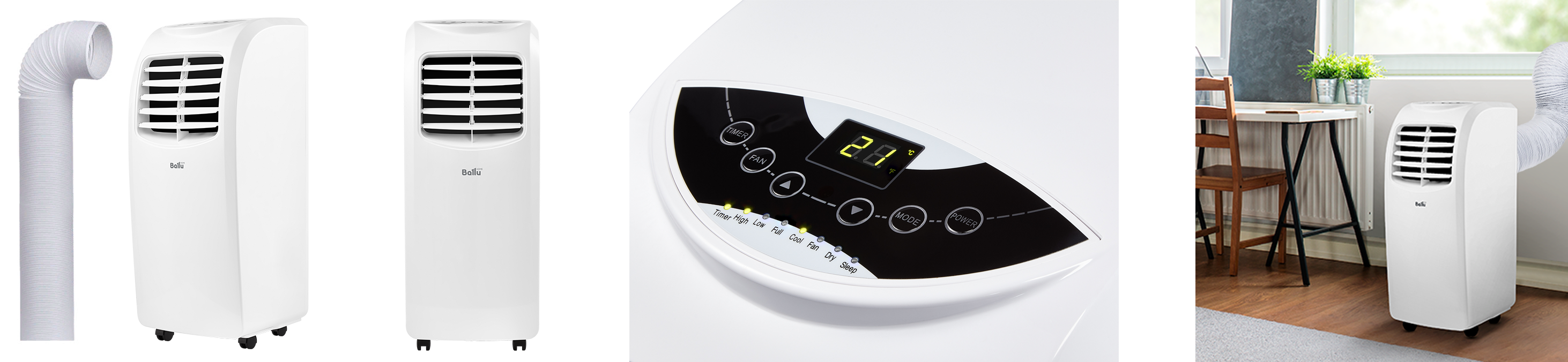 Компактный переносной моноблок, работает в 3 режимах: охлаждение, вентиляция и осушение. На верхней поверхности расположена панель управления с информационным LED-дисплеем и световой индикацией режимов работы. Особенностью мобильного кондиционера является организация отвода горячего воздуха через воздуховод и специальное отверстие в окне или стене на улицу. Необходимые элементы для монтажа воздуховода поставляются в комплекте.