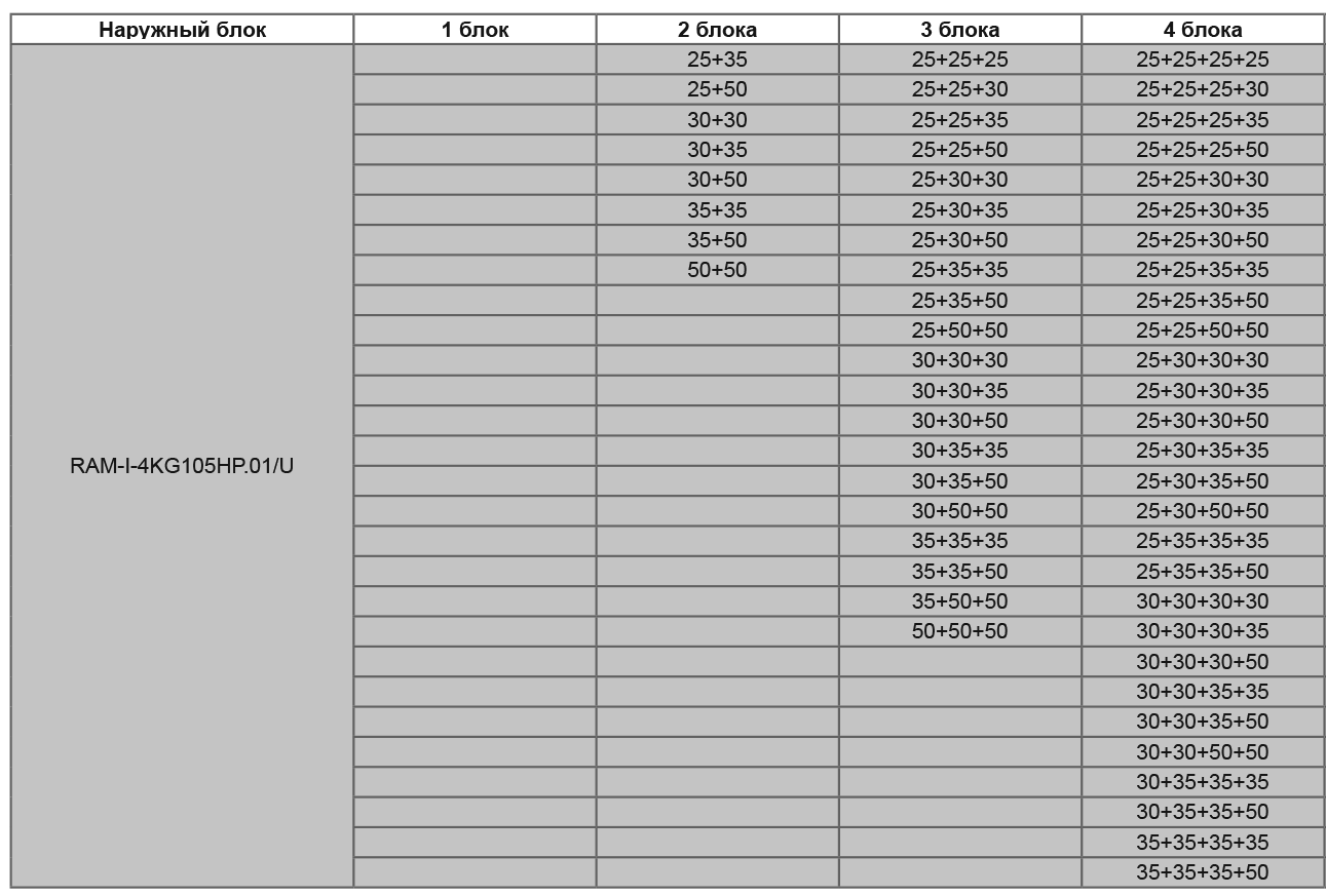 При подключении нескольких внутренних блоков, суммарная производительность которых превышает номинальную мощность наружного блока, при одновременной эксплуатации каждый из них будет работать со сниженной производительностью. Такой вариант подключения допускается в случае, когда внутренние блоки используются не одновременно (например, ночью – спальня, днем – гостиная).