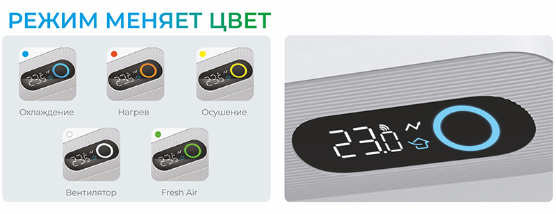 • Высокоинформативный модуль индикации — меняя цвет, индикатор отображает режимы работы кондиционера ROYAL FRESH STANDARD: режим охлаждения — синий, режим нагрева — оранжевый, режим осушения — желтый, режим вентилятора — белый, независимый Fresh Air — зеленый