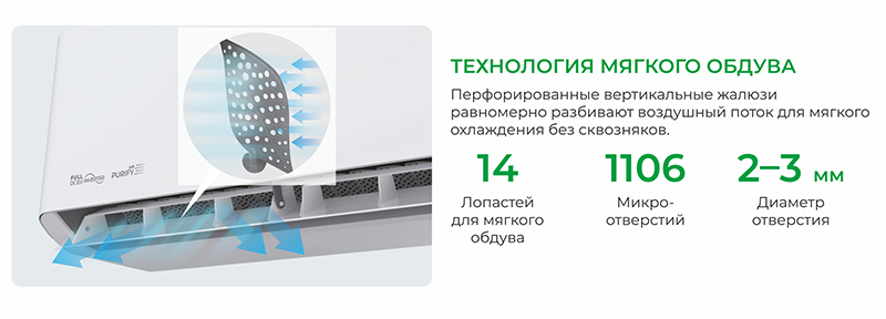 • Технология мягкого обдува — необычные вертикальные заслонки с перфорацией создают рассеивающий эффект, мягко распределяя поток воздуха по всему объему помещения.