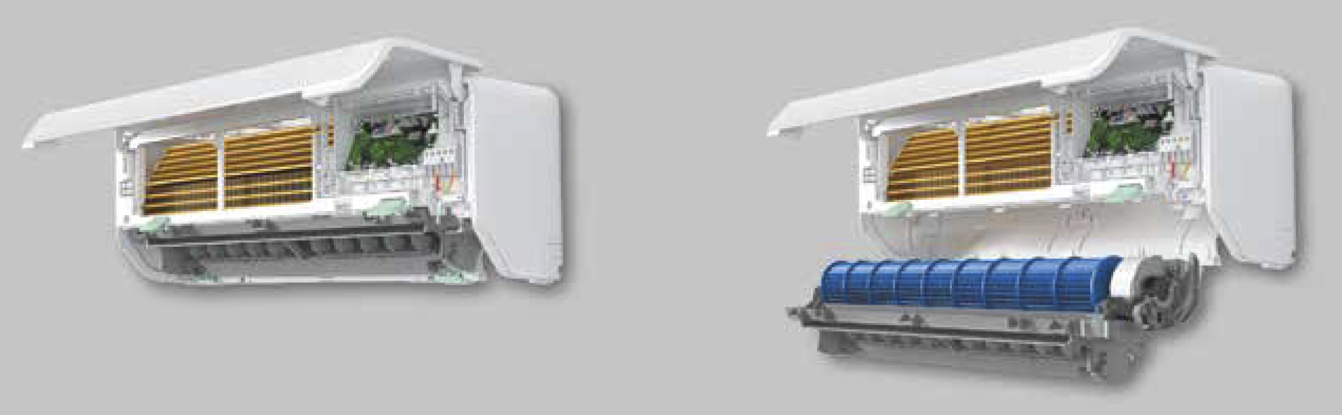 «Golden Fin». Антикоррозийное покрытие теплообменника Golden Fin из диоксида титана. Технология «Golden Fin» значительно улучшает эффективность теплообмена, а также увеличивает срок эксплуатации кондиционеров более чем в 5 раз. Кроме этого, новое покрытие теплообменника позволяет уменьшить аэродинамическое сопротивление воздуха и уровень шума кондиционера.