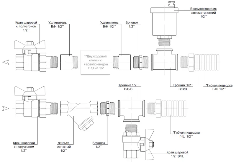 Кран шаровой с полусгоном – 2 шт. Фильтр сетчатый – 1 шт. Тройник – 2 шт. Кран шаровой (дренажный кран) – 1 шт. Бочонок (ниппель) – 2 шт. Воздухоотводчик автоматический – 1 шт. Удлинитель – 2 шт.