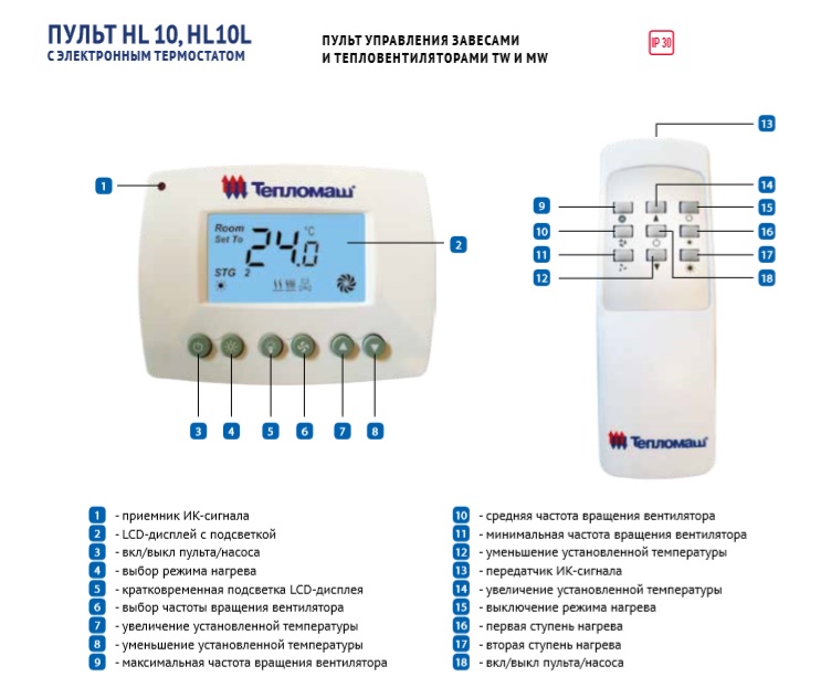 Предназначен для управлением завесами. Проводной, выносной пульт управления с электронным цифровым дисплеем. Возможно регулировать расход воздуха, уровень нагрева, выбирать единицу измерения температурных данных (°C/°F), имеется память настроек в случае аварийного отключения сети.