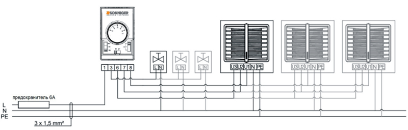 НЕАТ - Термостат посыпает сигнал на открытие клапана с сервоприводом и запуску вентилятора. Вентилятор отключается, когда температура в помещении достигнута, сервопривод закрывает клапан по достижении температуры, теплоноситель не расходуется.