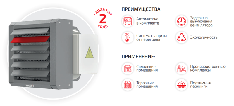 Тепловентилятор ГРЕЕРС ЕС является элементом децентрализованной системы отопления. Предназначен для отопления общественных, торговых и промышленных объектов. Принцип работы тепловентилятора основан на нагреве электрических элементов, которые отдают тепло струе нагнетаемого воздуха.