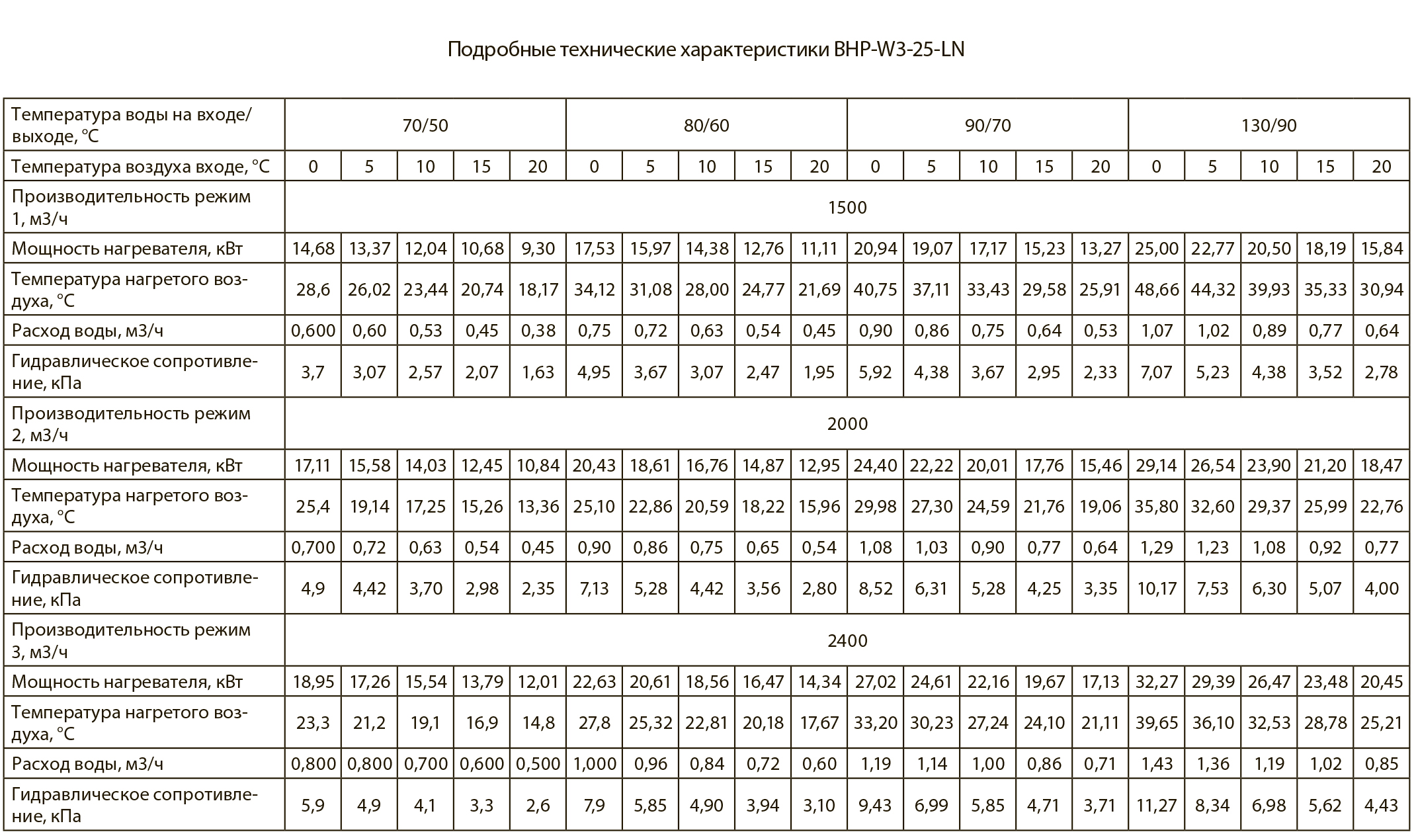 Тепловые характеристики приведены при температуре воздуха на входе +0 °С, максимальном расходе воздуха и максимальной температуре теплоносителя (указанной в таблице тепловой мощности от производителя).