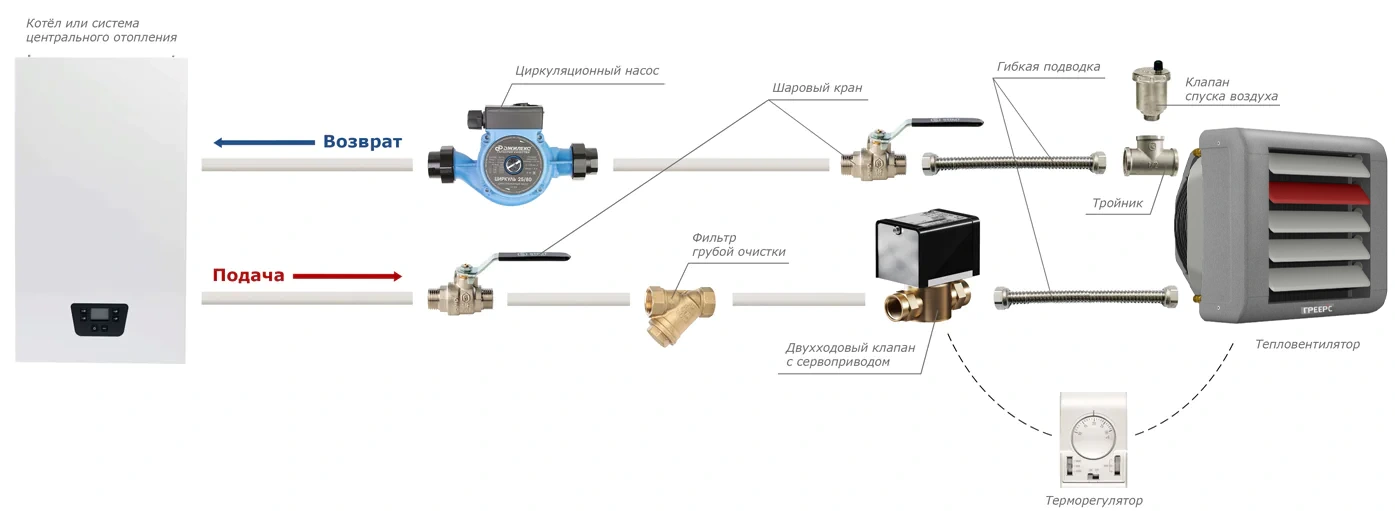 Тепловентилятор подключатся к источнику горячего водоснабжения или отопления с помощью гибкой подводки. Принцип работы основан на протекании горячей воды через теплообменник, который отдает тепло струе нагнетаемого воздуха. Монтаж может быть настенным или подпотолочным, крепится на поворотную консоль (идет в комплекте).