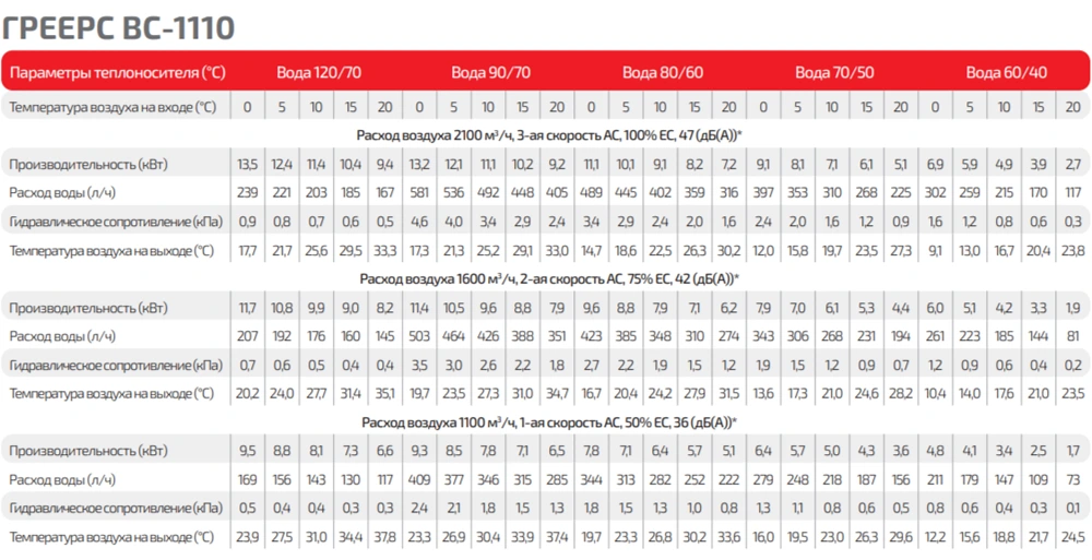 градусов С на выходе, при "t" воды 90/70 °С