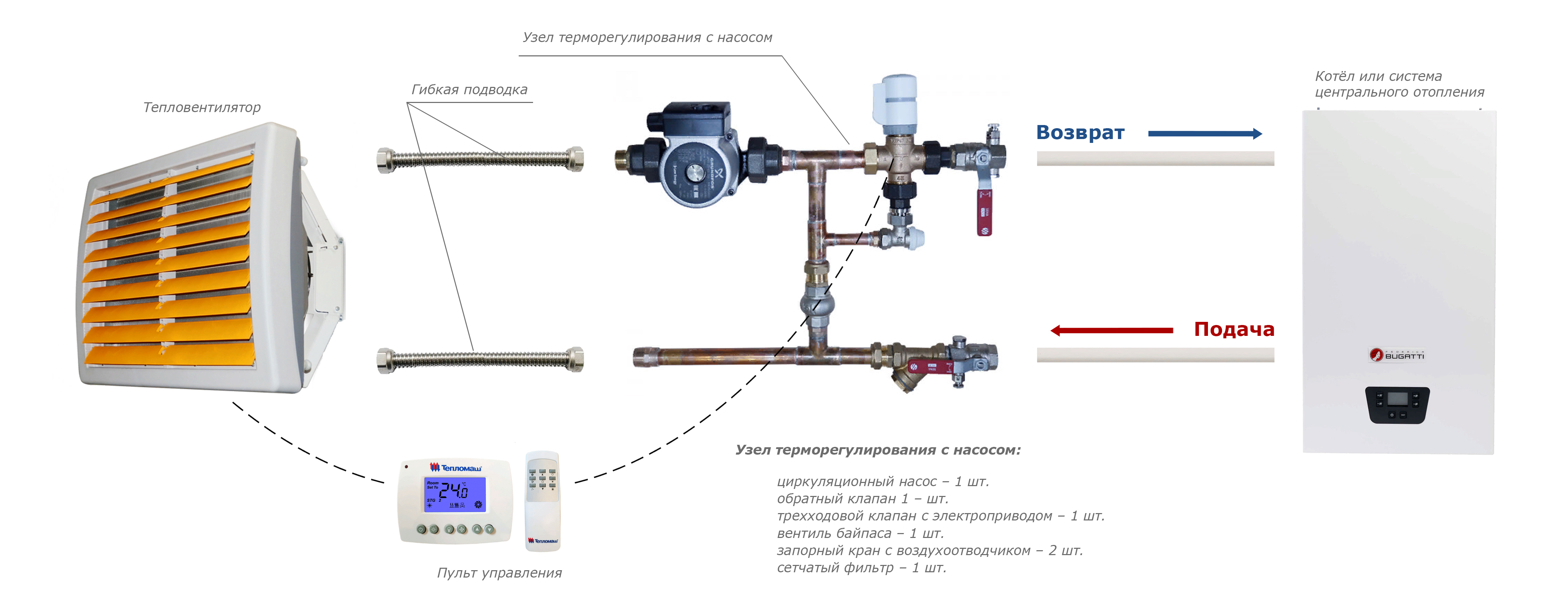 • Стандартная комплектация: тепловентилятор + проводной пульт HL10 с электронным термостатом — поддержание заданной температуры осуществляется за счет включения/выключения вентилятора и его работы на выбранной скорости. При достижении необходимого уровня температуры вентилятор отключается, теплоноситель продолжает циркулировать.