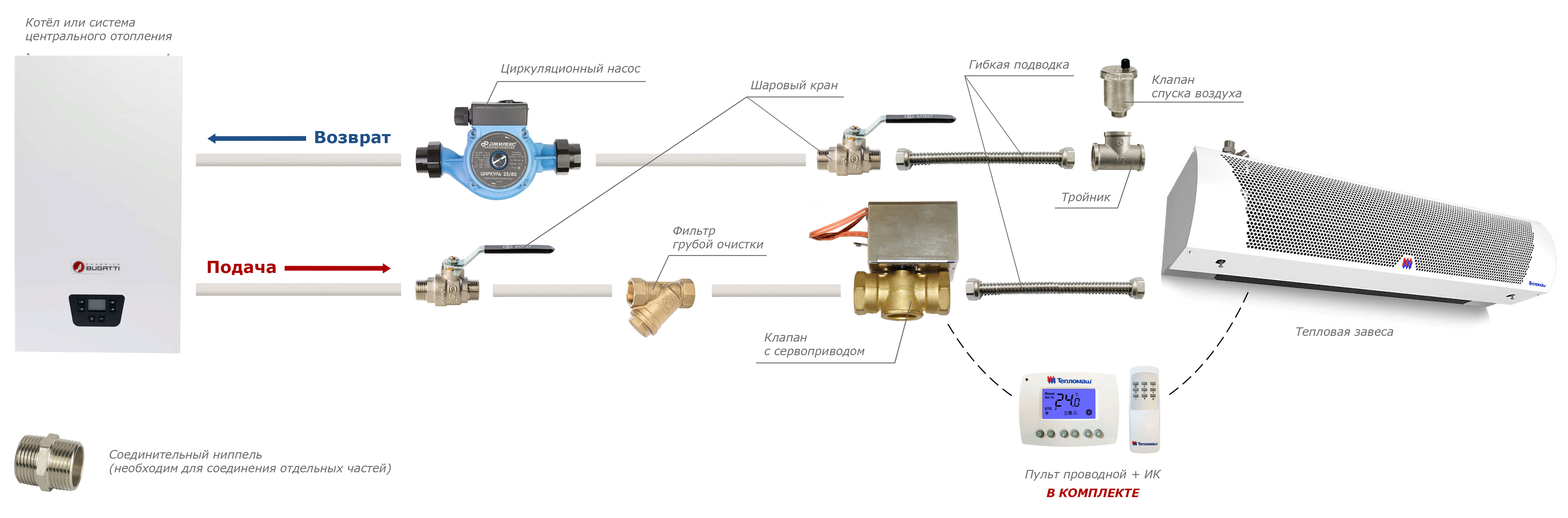 - Опциональное подключение клапана с сервоприводом меняет принцип работы: клапан, по команде термостата перекрывает или открывает подачу теплоносителя, вентилятор продолжает работу.